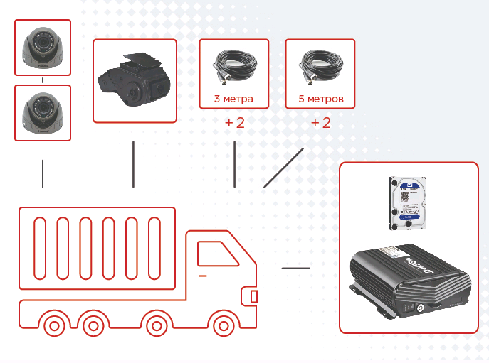 Универсальный комплект системы видеонаблюдения, которая устанавливается на транспортное средство. Благодаря наличию системы видеонаблюдения на грузовике, вы всегда будете знать, что происходило в кабине и как транспортировался груз на маршруте.
